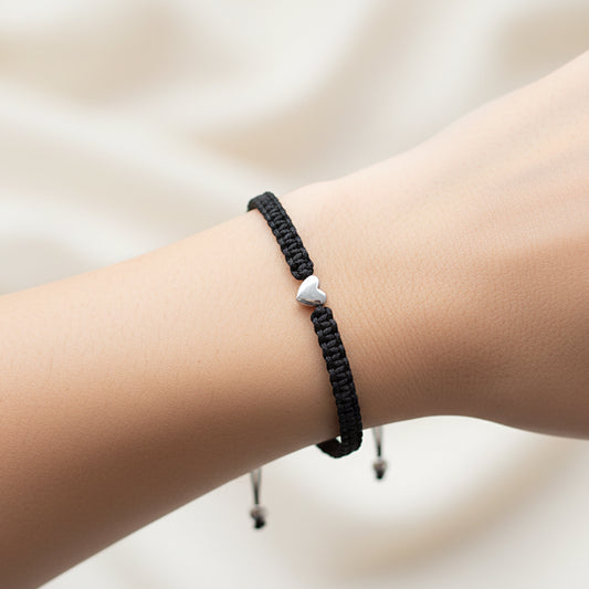 Unisex Braided Black Cord Bracelet with Silver Heart Bead – Adjustable Friendship Jewelry
