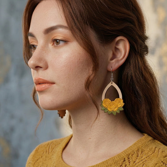 Hand-Painted Rose Blossom Laser-Cut Wood Earrings | jewellery for women