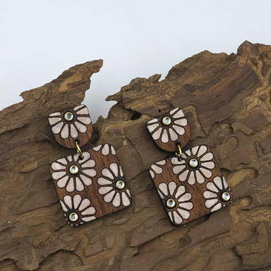 wooden earrings | floral design embellished with stones | hand-painted wooden statement earrings