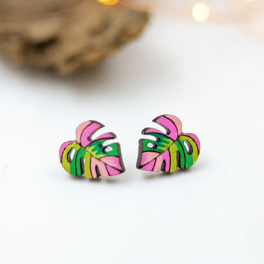 monstera leaf earrings | wooden stud earrings | hand-painted stud earrings | for women and kids