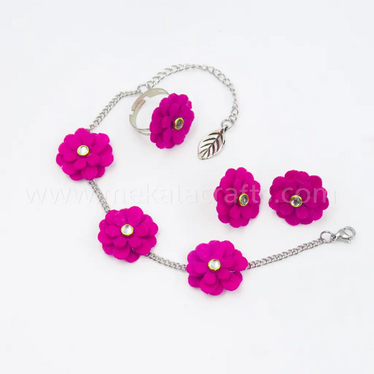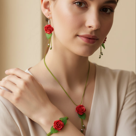 Handmade Red Rose Jewelry Set – Earrings, Bracelet & Necklace with Green Leaf Accents