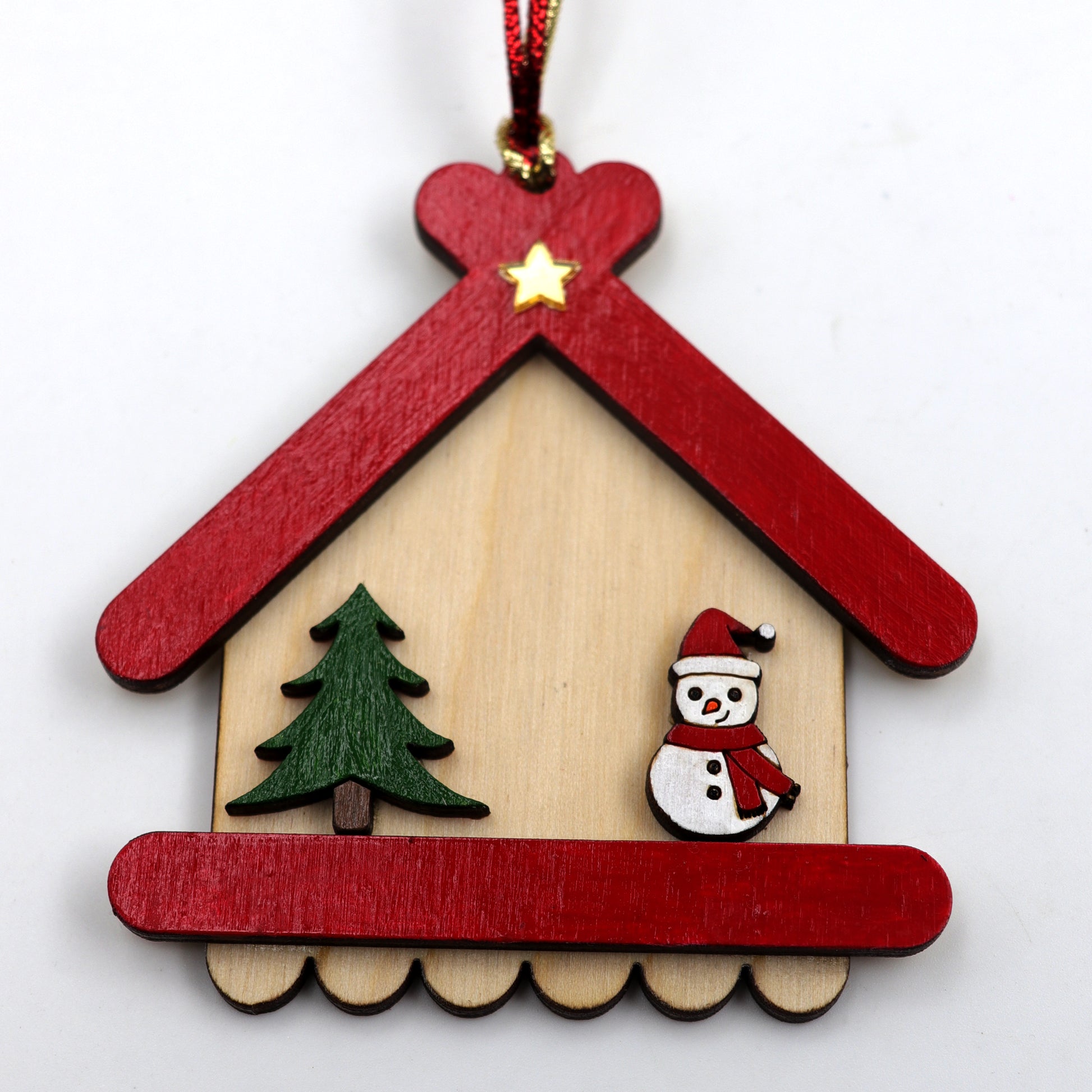 Deck the halls with this charming wooden Christmas ornament! A sweet little house with a green tree and a smiling snowman makes this decoration a delightful addition to your Christmas tree. Lightweight and easy to hang, it's perfect for families and children to enjoy year after year.