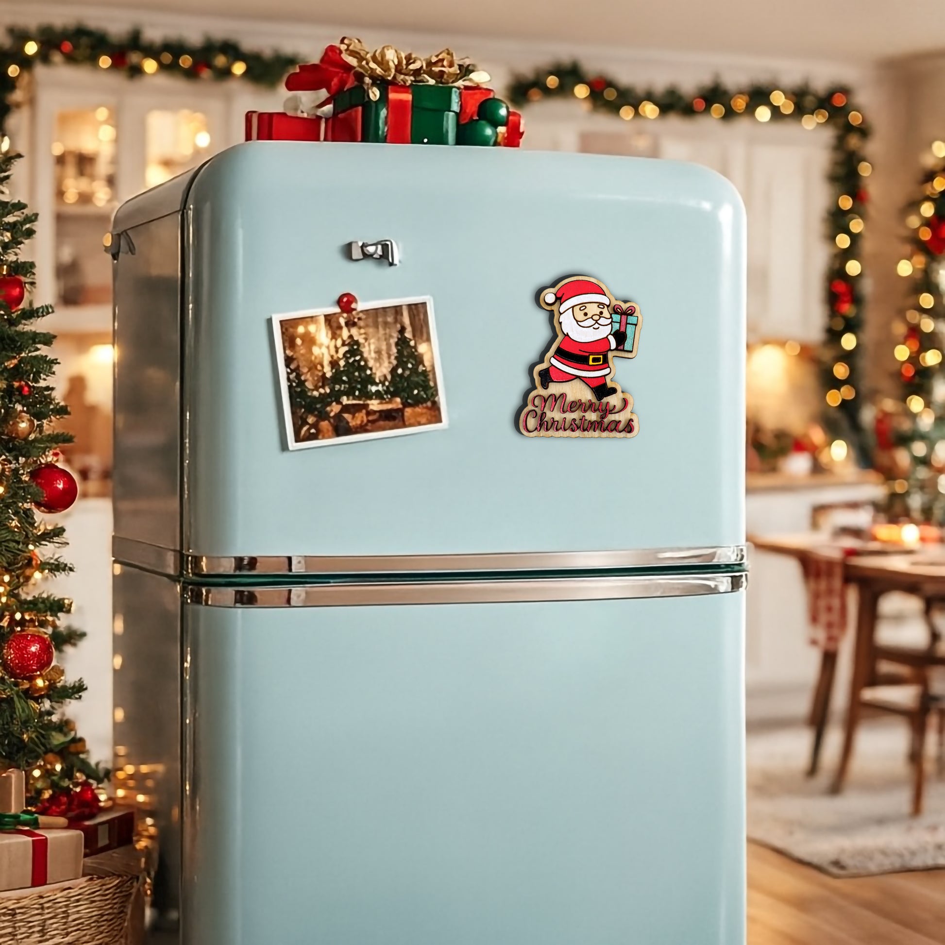 Crafted from premium wood and precision laser-cut for crisp details, this adorable magnet features a cheerful Santa carrying a gift above a beautifully scripted “Merry Christmas” message. Each piece is individually hand-painted, giving it a warm, artisanal feel that stands out on any fridge, whiteboard, or metal surface.