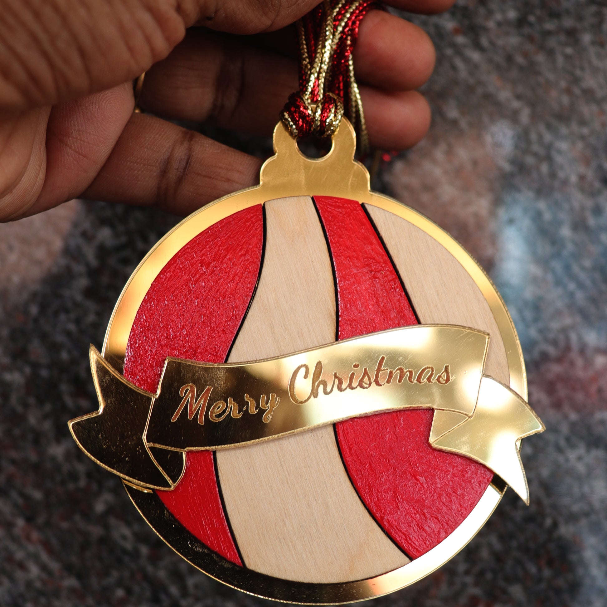 Bring a touch of classic charm to your holiday decor with our "Merry Christmas" Wooden & Gold Ornament. This beautifully crafted ornament features a rustic wooden base with vibrant red stripes, accented by a shimmering gold metallic overlay. A delicate gold banner proudly displays "Merry Christmas," making it a perfect addition to your tree or a thoughtful gift for loved ones. The elegant design and festive message embody the spirit of the season, creating cherished memories year after year. Each ornament comes with a festive red and gold ribbon for easy hanging.